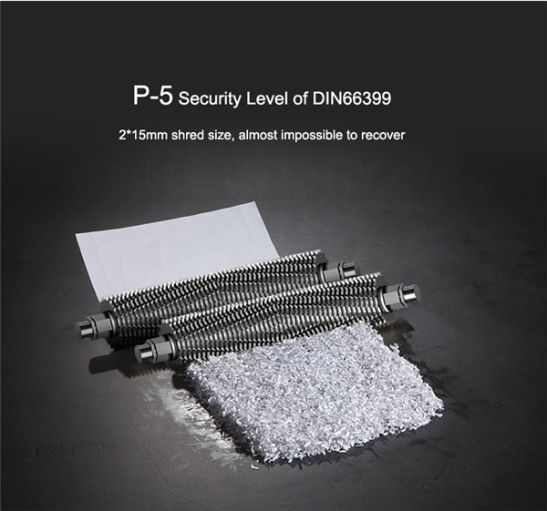 1. Shred capacity: Shreds 6 sheets per pass into 2*15mm micro-cut particles (Security Level P-5) for enhanced security on highly confidential documents to help keep your information safe.